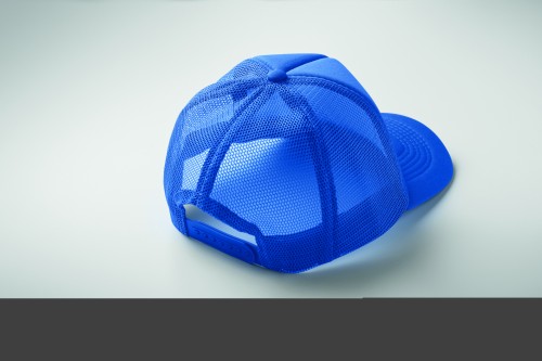 5 panel truckers cap in polyester 140-150 gr/m² with adjustment plastic snap closure. White front panel and colour visor in polyester jersey with foam backing. Other panels in colour mesh. Size 7 1/4.