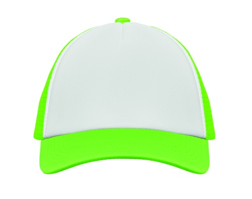 5 panel truckers cap in polyester 140-150 gr/m² with adjustment plastic snap closure. White front panel and colour visor in polyester jersey with foam backing. Other panels in colour mesh. Size 7 1/4.