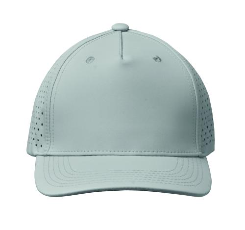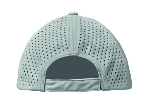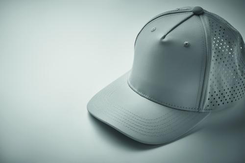 5 panel polyester performance cap with adjustable hook and loop closure and laser perforated holes with 2 stitched eyelets in matching colour. Item is quick dry, sweat and water repellent. 130 gr/m²