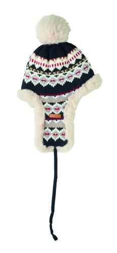 Knitted beanie with ear flaps and pompom in acrylic fibre with polyester and fleece lined. Includes label for printing area on one side. Adult size.