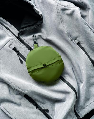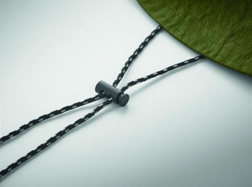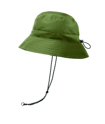 Water repellent fisherman hat made of polyester, includes self material pouch with ABS carabiner. 64 gr/m².