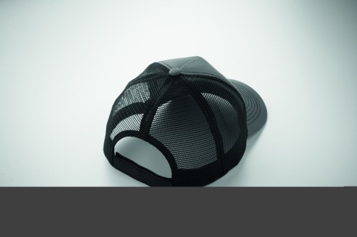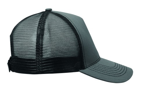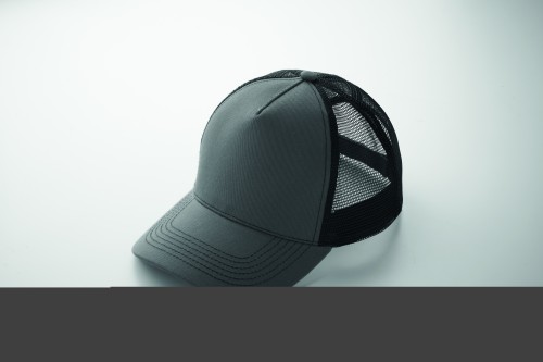 5 panel trucker cap with front panel and visor in 250 gr/m² cotton, back mesh in polyester, hook and loop closure.