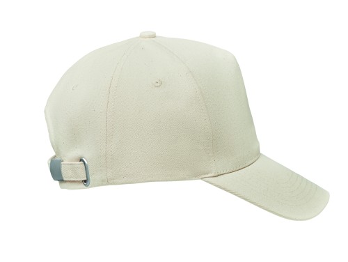 5 panel baseball cap in 250 gr/m² organic brushed cotton with metal adjustable strap back buckle closure.