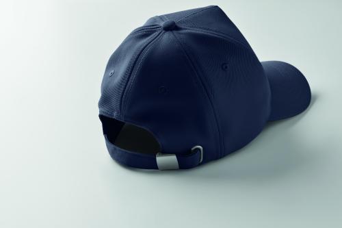 RPET 5 panel baseball cap in polyester 210 gm/m2 with silver steel buckle. 4 embroidered eyelets in matching colour. Size 7 1/4.