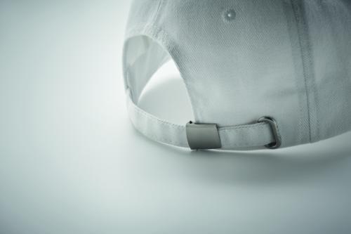 5 panel baseball cap in heavy brushed twill cotton 260 gm/m2 with silver steel buckle. 4 embroidered eyelets in matching colour. Size 7 1/4.
