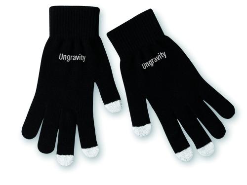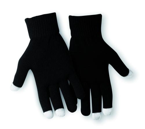 Tactile gloves for smartphone in acrylic. The 3 tactile extremities of the fingers are composed of 0.5% in stainless steel fibre, 89.5% in acrylic, 10% in spandex.