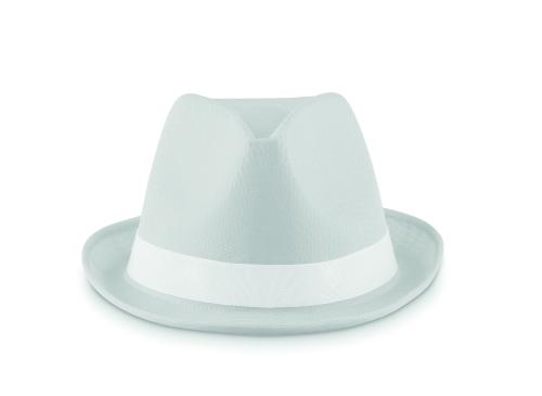 Coloured hat in polyester straw with white coloured band. For unprinted orders the band will be supplied unattached to the items