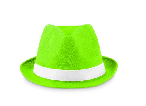 Coloured hat in polyester straw with white coloured band. For unprinted orders the band will be supplied unattached to the items