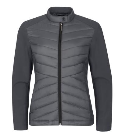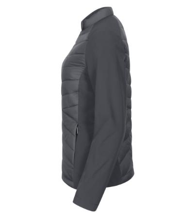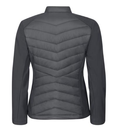 combination of quilted and softshell fabric, cut fitted by side parts, stand up collar with snap button, full-length coil zipper, side pockets with coil zipper, inner breast zip pocket , access for branding in back lining