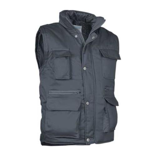 Outside 65% polyester, 35% cotton, 200 g/m² twill fabric. Padded 100% polyester 220 g/m². 8 outside pockets. 1 inside pocket. 2 pen compartments. Right chest pocket for phone. High collar with total zip. Back lateral regulators. Back wide area for printing. Back side longer. Arm hole inside cover. 20 units per box: 1 size, 1 color. Individual bag.