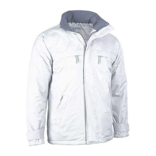 Outside fabric rip stop system with PVC coating. Waterproof treatment. Padded 100% polyester 220 grs/m2. Inside taffeta and polar fleece lining. 2 flap chest pockets with zip. 2 bottom front pockets with zip. Sleeve cuffs with velcro. Hood with adjus