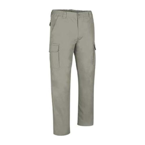 Trousers 65% polyester, 35% cotton. 240 grs/m² twill fabric. 1 cargo pocket on left leg. 1 cargo pocket + cutter knife pocket on right leg. 2 back flap pockets. 2 waist pockets. Elastic waist. Reinforced seams. 20 units per box: 1 size, 1 color. Individual bag.