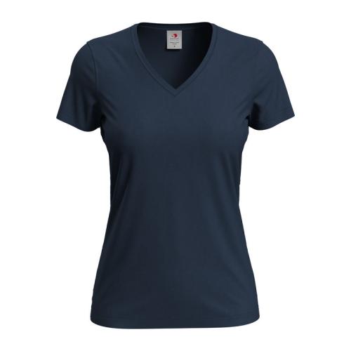 Classic V-neck style for women. Soft, with side seams and made of durable single jersey cotton.