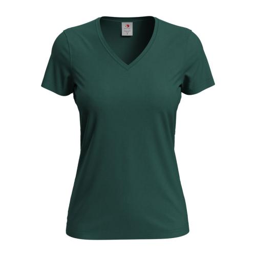 Classic V-neck style for women. Soft, with side seams and made of durable single jersey cotton.