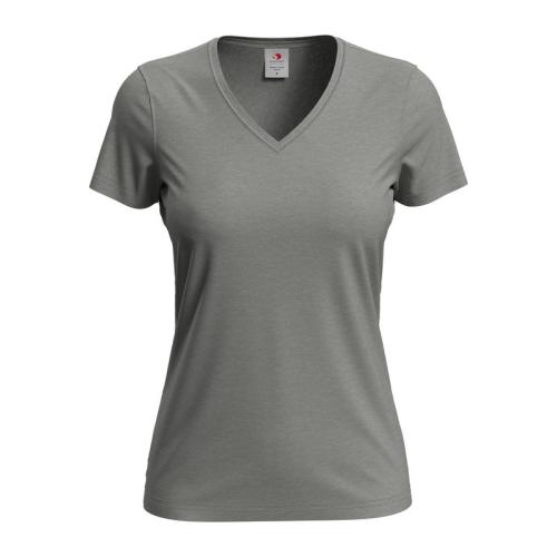 Classic V-neck style for women. Soft, with side seams and made of durable single jersey cotton.