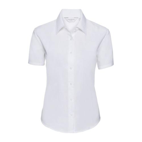70% cotton, 30% polyester women's short-sleeved shirt. 40° washable, suitable for tumble drying, easy wear. Tailored fit, classic blouse collar, rounded hem, replacement buttons, darts on the chest and back for good fit. 135g/m²