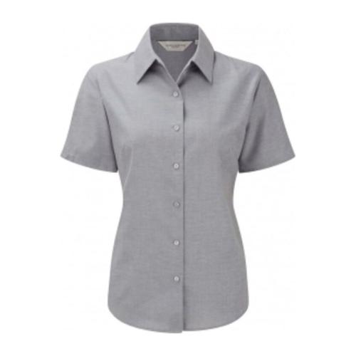70% cotton, 30% polyester women's short-sleeved shirt. 40° washable, suitable for tumble drying, easy wear. Tailored fit, classic blouse collar, rounded hem, replacement buttons, darts on the chest and back for good fit. 135g/m²