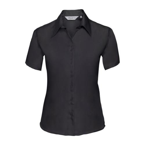 100% cotton-micro-twill women's short-sleeved shirt. 40° washable, suitable for tumble drying, non iron. Tailored fit, generously cut collar with long tips, rounded hem, double stud closure, replacement buttons, innovative fabric that keeps the blouse fresh and in shape all day. 120g/m²