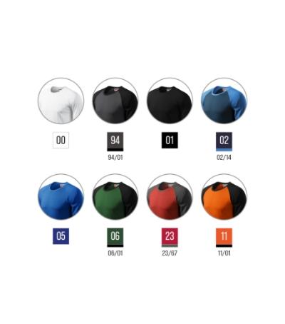 two-colour design (except colour 00, 01, 05), cut with side seams, narrow 1:1 rib knit neckline hem with 5 % elastane, inner back neckline with a shell fabric tape, long raglan sleeves with cuffs, 1:1 rib knit cuff with 5 % elastane, Product transferred under the RIMECK® brand. Products with new and original branding can occur together in one order. Such occurrence will not be considered as a reason for complaint.