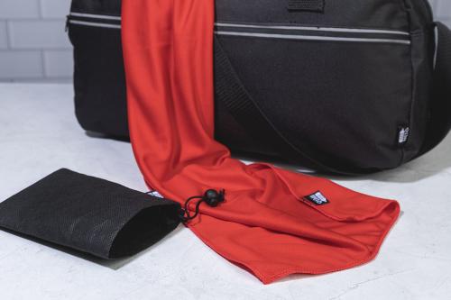 RPET microfibre sport towel in RPET non-woven carry pouch with distinctive RPET label. RPET polyester, 140 g/m².