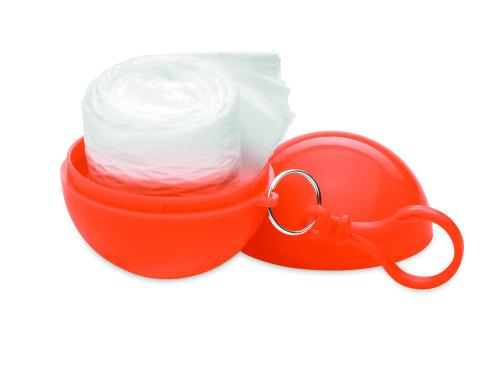 Transparent PE poncho wrapped in an AS ball shell with carabiner hook to hang on a belt or a bag.