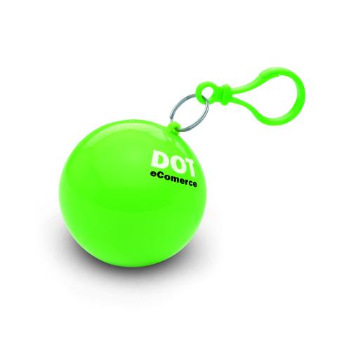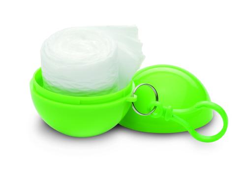 Transparent PE poncho wrapped in an AS ball shell with carabiner hook to hang on a belt or a bag.