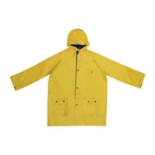 Bicolour reversible raincoat, made of PVC, in standard XL size with pushbuttons and hood.