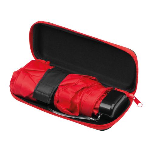 190T polyester mini umbrella packed in an EVA zippered pouch, for easy carrying.