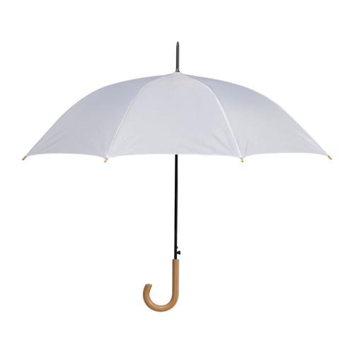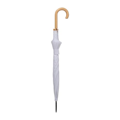 Automatic umbrella made of 190T polyester with curved wooden handle and wooden tips.