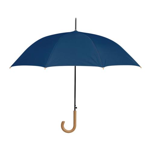 Automatic umbrella made of 190T polyester with curved wooden handle and wooden tips.