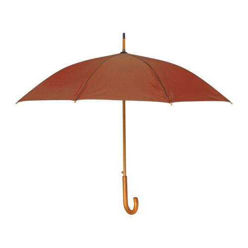 Automatic umbrella with curved wooden handle and wooden tip.