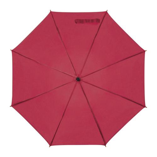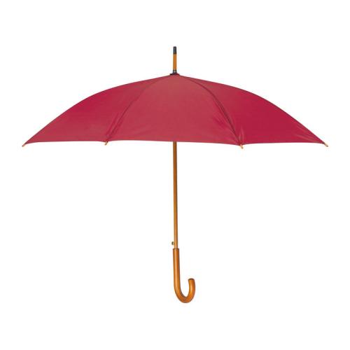 Automatic umbrella with curved wooden handle and wooden tip.