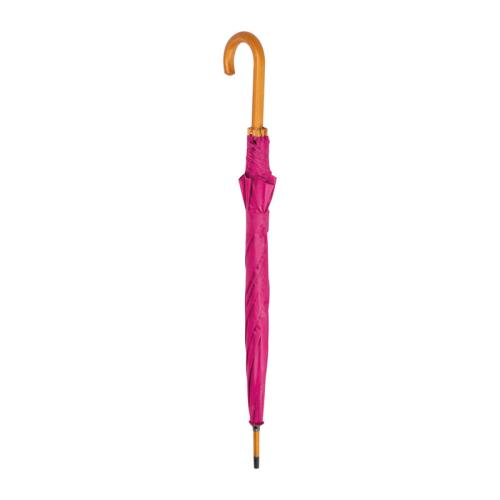 Automatic umbrella with curved wooden handle and wooden tip.