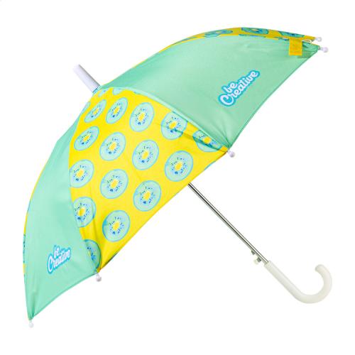 Custom made, 8 panel automatic umbrella for kids with metal frame and plastic handle. 190T RPET pongee. With distinctive RPET label and sublimation printed graphics on all panels. MOQ: 50 pcs.