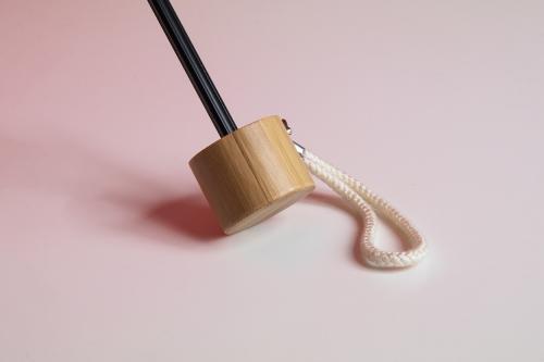 Manual, windproof 3-folding mini umbrella with 6 panels in matching colour pouch. With metal frame, fibreglass ribs, bamboo handle and cotton hand strap. 190T RPET pongee, with distinctive RPET label.