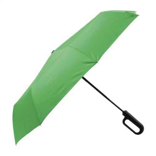 Full automatic (open/close), windproof folding umbrella with 8 panels in matching colour pouch. With metal frame, fibreglass ribs and rubberized carabiner loop handle. 190T RPET pongee. With distinctive RPET label.