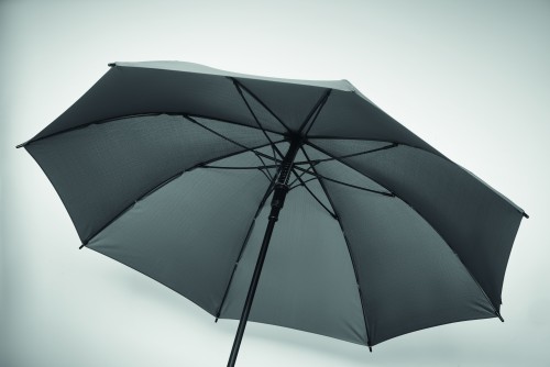 23 inch auto open windproof umbrella in 190T pongee with fiberglass frame and black plated shaft and plastic tips. ABS handle with rubber finish. Manual closure.