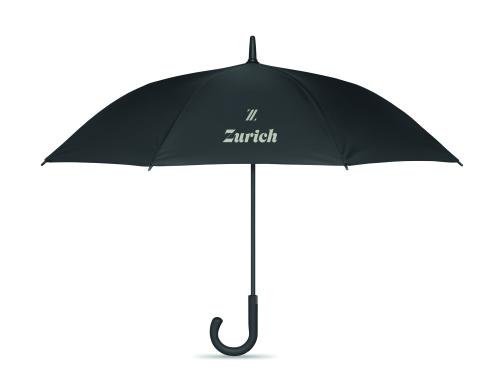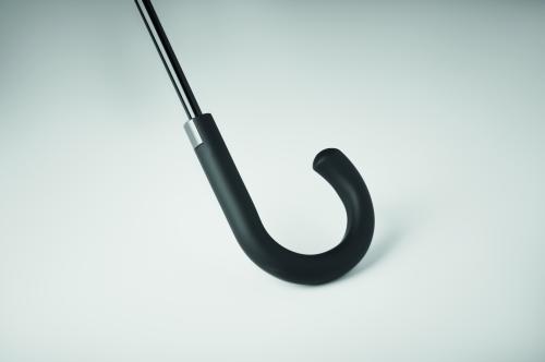 23 inch auto open windproof umbrella in 190T pongee with chequered inside pattern. Fibreglass frame with black plated shaft and plastic tips. Curved rubber finished handle. Manual closure.