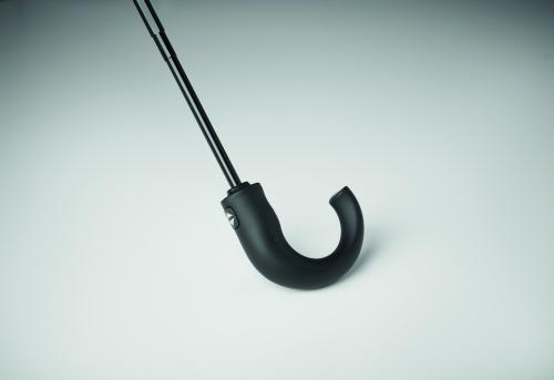 23 inch 3 fold auto open/close windproof umbrella in double-layer 190T pongee with chequered inside pattern. Black plated frame and shaft. Two-section black fibreglass nickel plated middle part. Curved wooden handle.