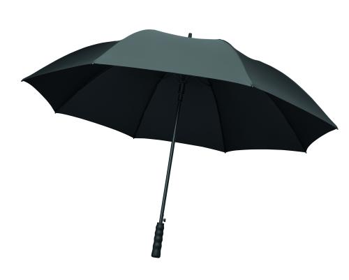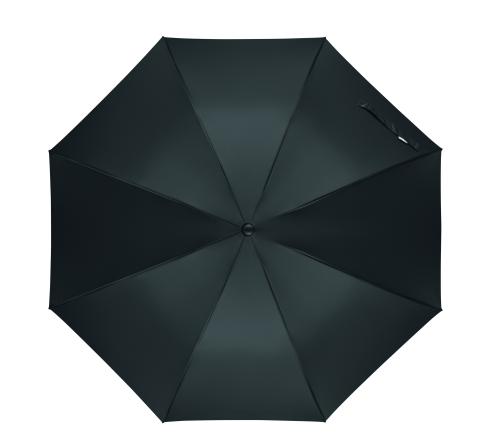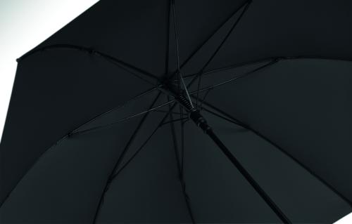 27 inch auto open wind-proof umbrella in 190T RPET pongee. Fibreglass shaft and ribs. Wheatstraw and recycled ABS handle. Plastic tips and top.