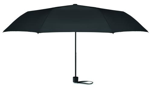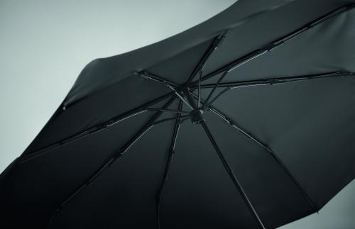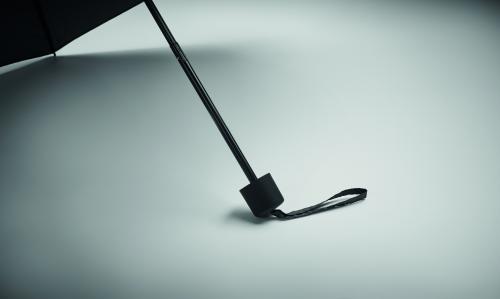 21 inch 3 fold manual open and closure windproof umbrella in 190T RPET pongee. Includes shopping bag pouch. Has hidden zippered compartment to hold umbrella and keep bag contents dry. When bag is not in use, it rolls up and zipper compartment acts as the umbrella sleeve.