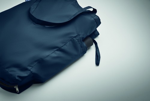 21 inch 3 fold manual open and closure windproof umbrella in 190T RPET pongee. Includes shopping bag pouch. Has hidden zippered compartment to hold umbrella and keep bag contents dry. When bag is not in use, it rolls up and zipper compartment acts as the umbrella sleeve.