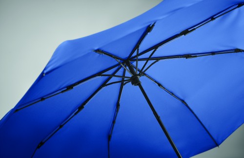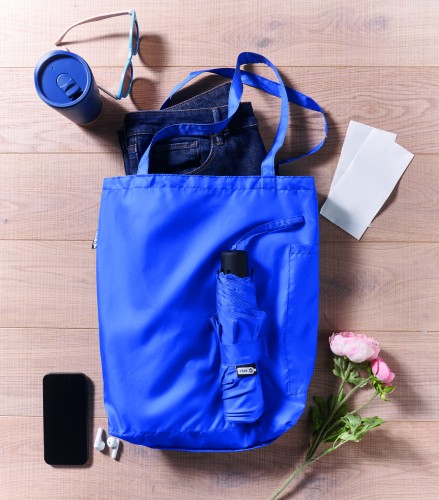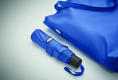 21 inch 3 fold manual open and closure windproof umbrella in 190T RPET pongee. Includes shopping bag pouch. Has hidden zippered compartment to hold umbrella and keep bag contents dry. When bag is not in use, it rolls up and zipper compartment acts as the umbrella sleeve.