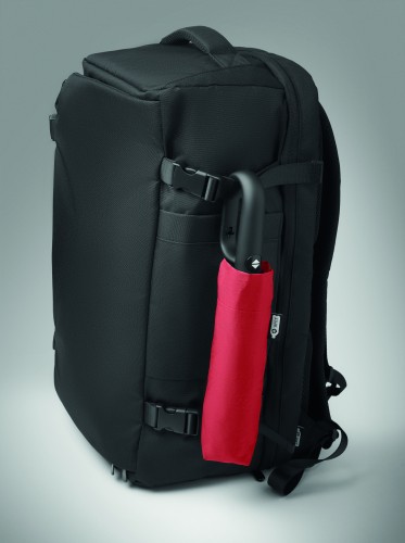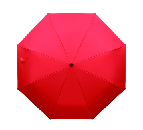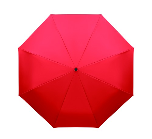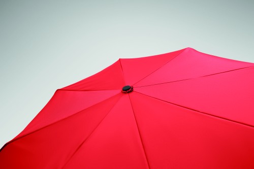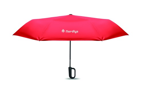 Foldable 21'' windproof umbrella with full black plating fibreglass frame with 2 sections. Fibreglass ribs. 190T RPET pongee panels. D shape carabiner handle w/ rubber finish. Auto open and closure. Includes pouch