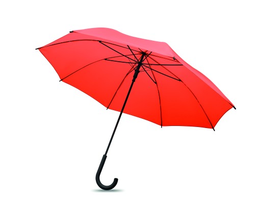 23 inch straight auto open umbrella with black plating metal frame, fibreglass ribs and panels in 190T pongee fabric. Plastic tips and top. Rubberized PP plastic curved handle. Manual closure.
