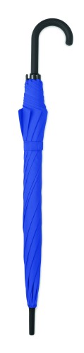 23 inch straight auto open umbrella with black plating metal frame, fibreglass ribs and panels in 190T pongee fabric. Plastic tips and top. Rubberized PP plastic curved handle. Manual closure.