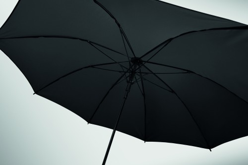 23 inch straight auto open windproof umbrella with full fibreglass frame and panels in 190T pongee fabric. Plastic tips and top. Rubberized PP plastic curved handle. Manual closure.