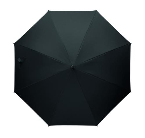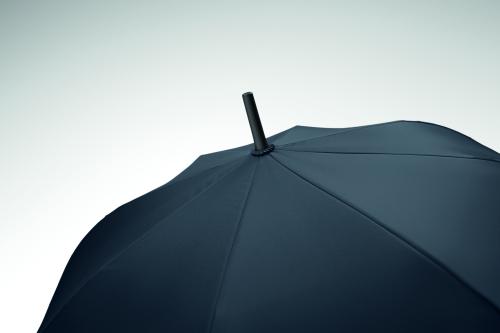 23 inch straight auto open windproof umbrella with full fibreglass frame and panels in 190T pongee fabric. Plastic tips and top. Rubberized PP plastic curved handle. Manual closure.