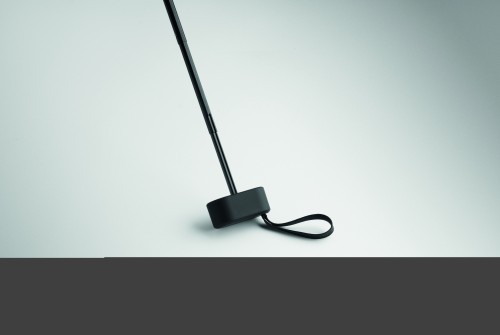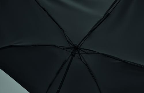 19-inch 5-fold manual umbrella made of 190T pongee with matching pouch. It has a metal and fibreglass windproof frame, black rubberized handle with wrist strap, and compact 17 cm folded size.