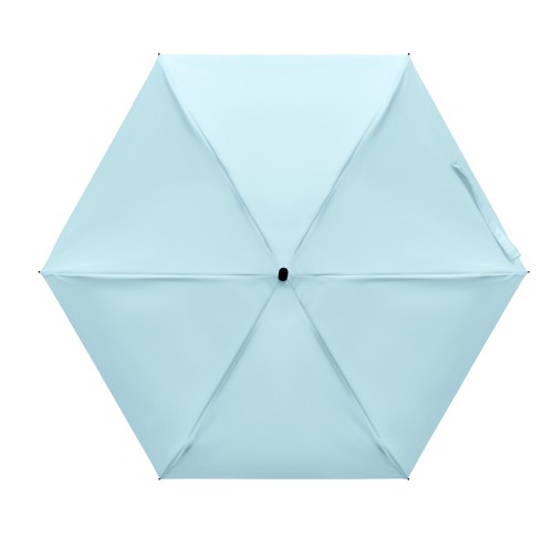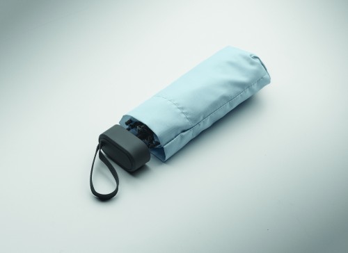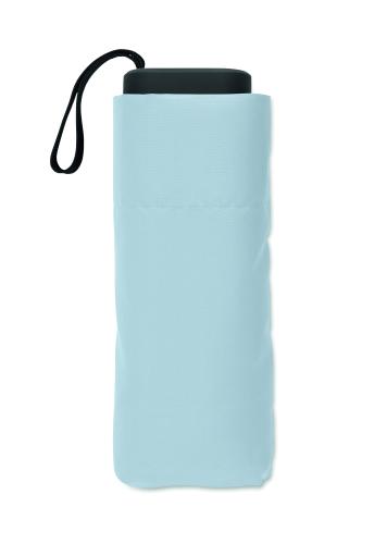 19-inch 5-fold manual umbrella made of 190T pongee with matching pouch. It has a metal and fibreglass windproof frame, black rubberized handle with wrist strap, and compact 17 cm folded size.